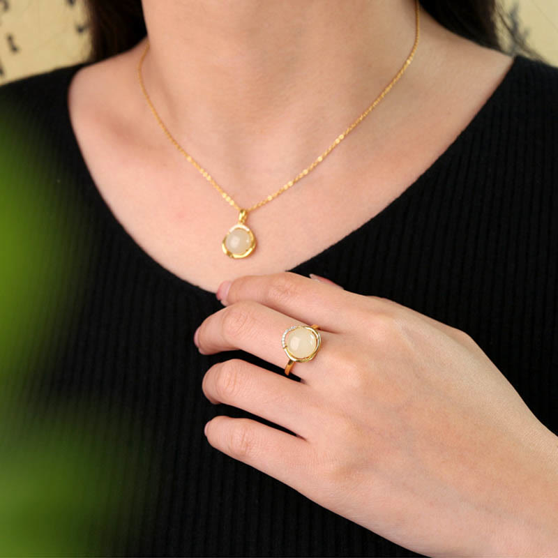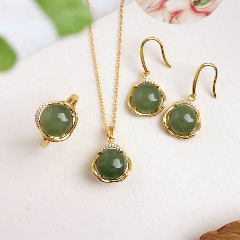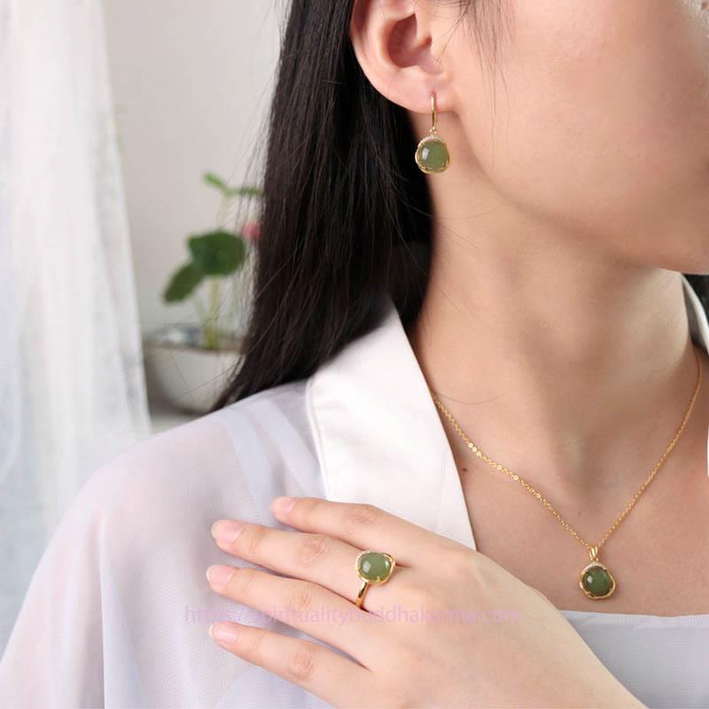 White and Cyan Jade set features natural Hetian white jade and cyan jade, symbolizing protection and harmony. This set includes a necklace pendant, ring, and earrings, crafted from 925 sterling silver. The white jade promotes purity and tranquility, while the cyan jade offers protection and balance. Ideal for those seeking to enhance their spiritual journey with positive energy and inner peace.