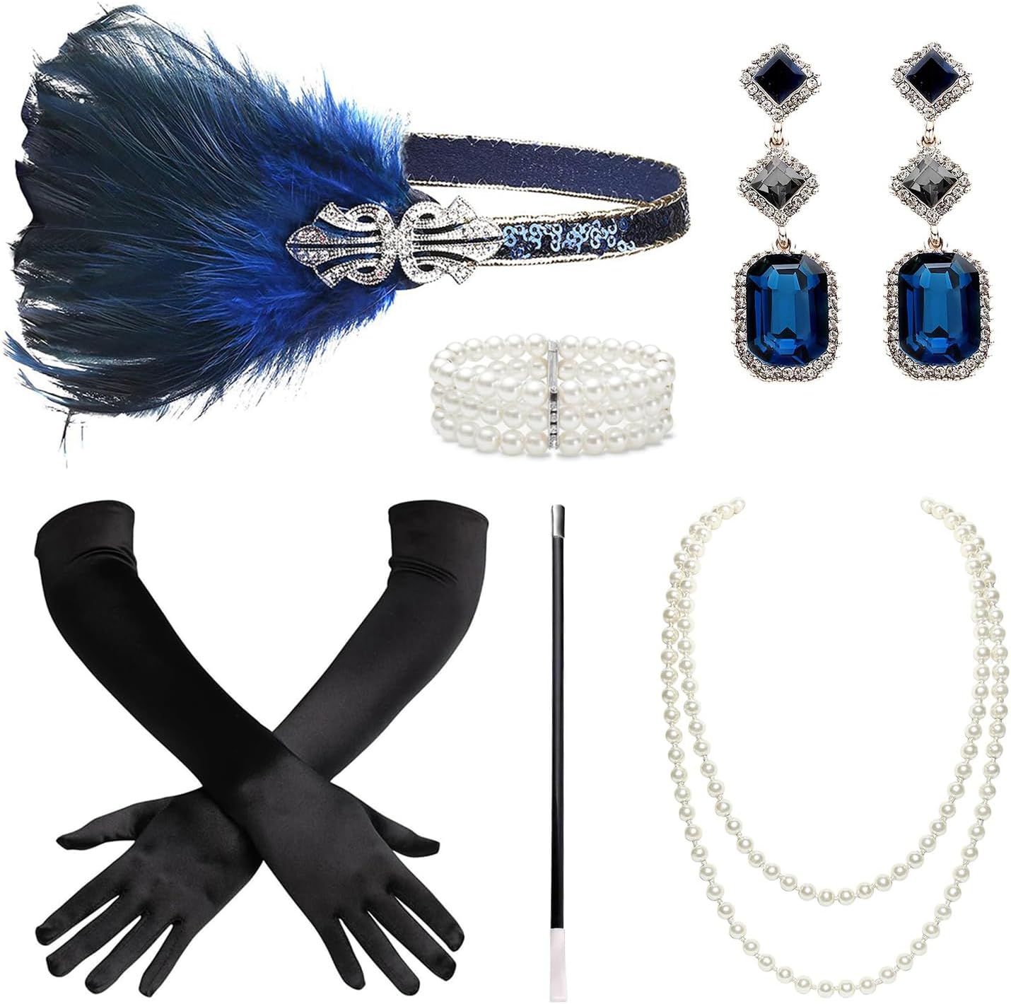 1920s Flapper Accessories Gatsby Costume Accessories Set 20s Flapper Headband Pearl Necklace Gloves Plastic Holder