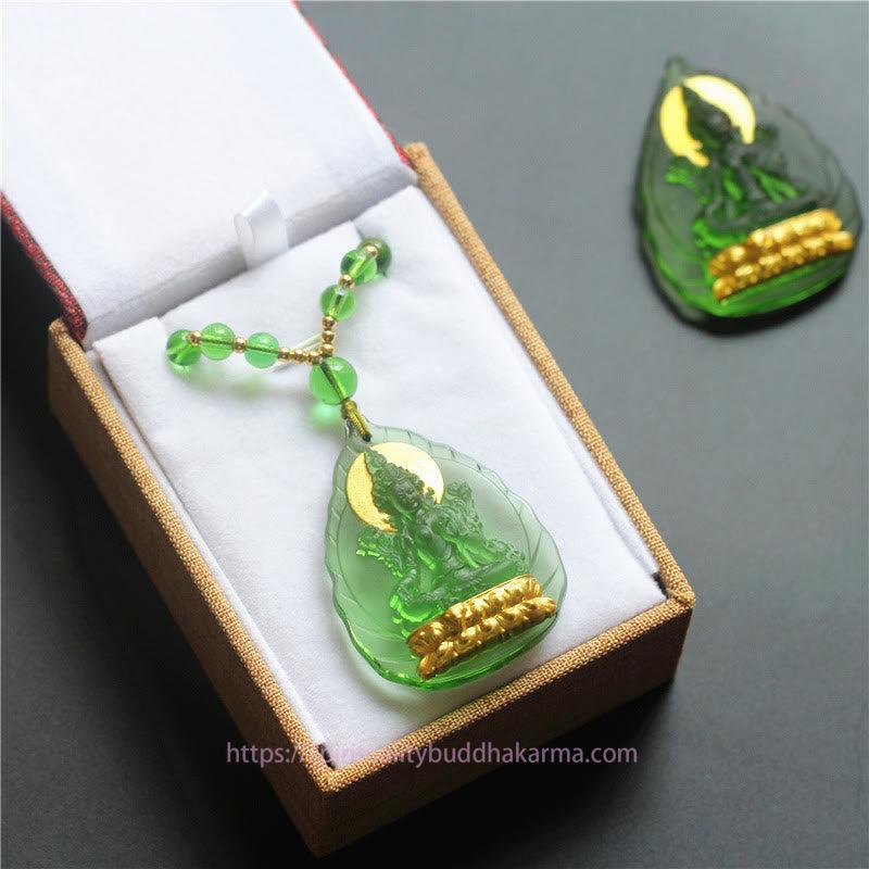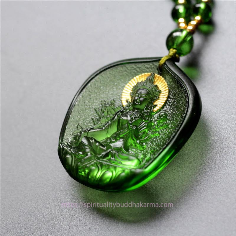 Experience the divine energy of our Spirituality Buddha Karma Tibetan Green Tara Buddha Gold Plated Liuli Crystal Protection Necklace Pendant. Handcrafted with exquisite Liuli crystal glass, this pendant embodies the powerful presence of Green Tara, offering hope, calm, and protection from evil spirits. Invoke the blessings of Bodhisattva Tara, bring serenity to your life, and embrace positive transformations.