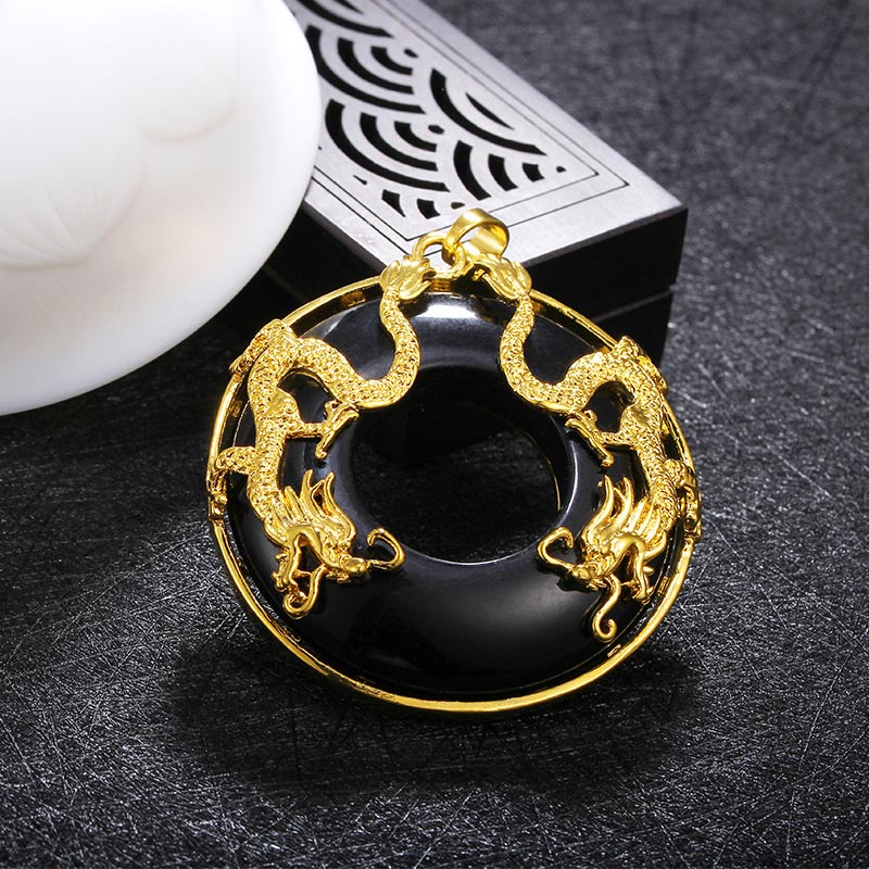 The Spirituality Buddha Karma Tibetan Jade Dragon Necklace Pendant is a unisex jewelry item made from high-quality materials. It features Cyan Jade, Black Onyx, and White Jade stones, each with their unique positive meanings, including success, healing, protection, luck, and harmony. The pendant itself is in the shape of a dragon, symbolizing luck, strength, protection, and the male element Yang. This handmade and natural necklace is environmentally friendly and comes with a separate chain. However, due to its natural materials, irregularities and slight color variations may occur.