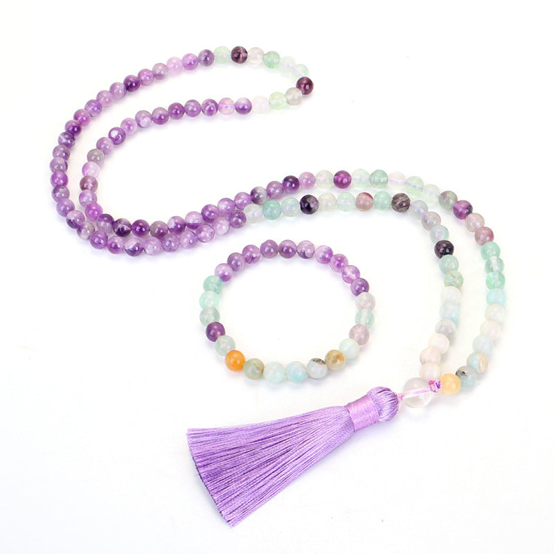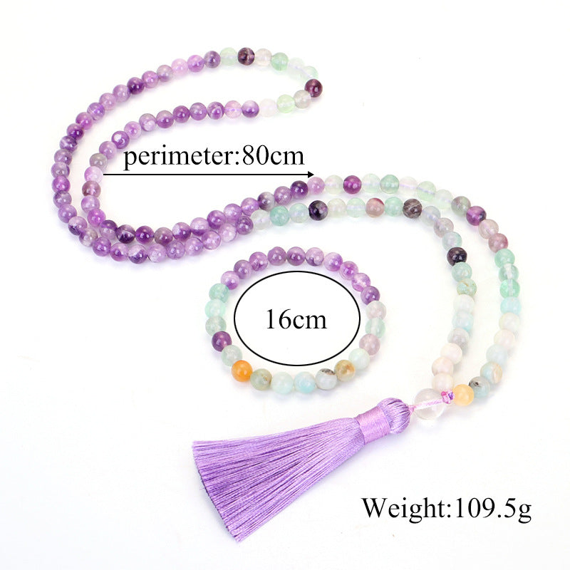 108 Mala Beads Amethyst, Amazonite & Fluorite Energy Necklace with Light Purple Tassel