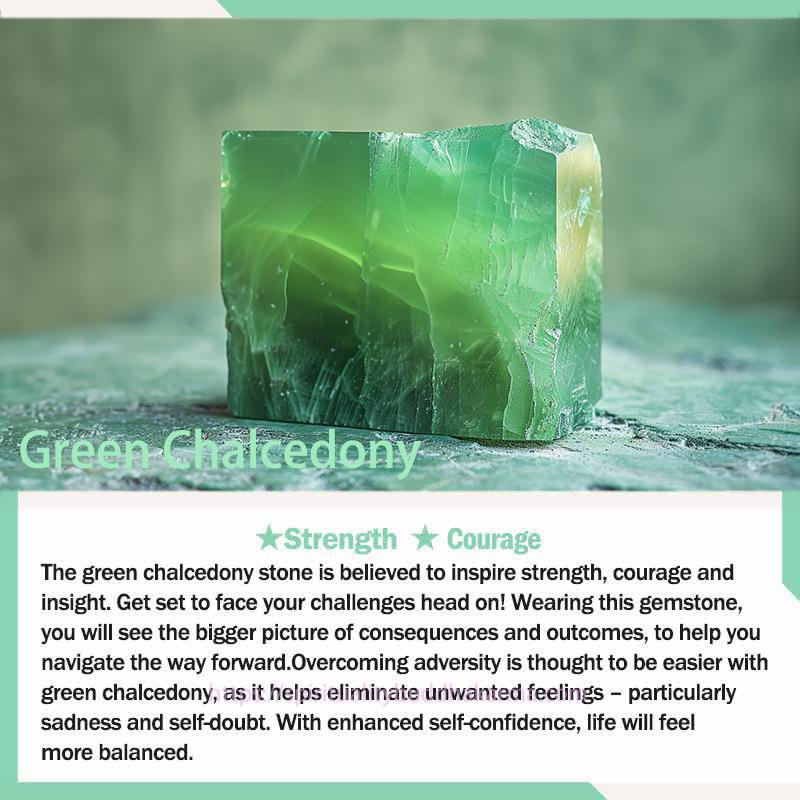 Overcoming adversity is thought to be easier with green chalcedony, as it helps eliminate unwanted feelings �particularly sadness and self-doubt. With enhanced self-confidence, life will feel more balanced.