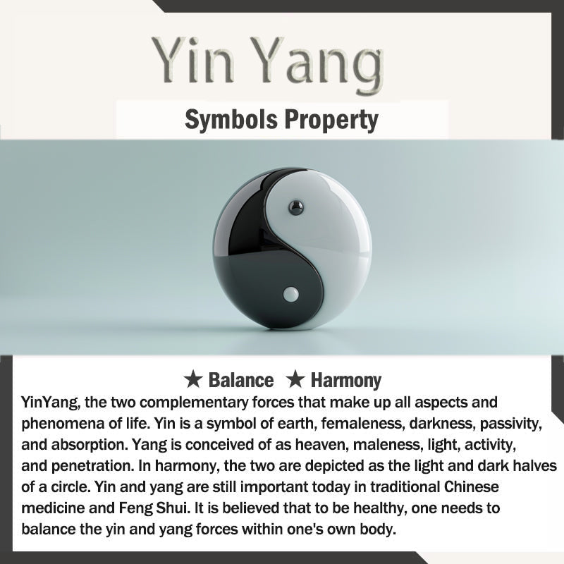 YinYang, the two complementary forces that make up all aspects and phenomena of life. Yin is a symbol of earth, femaleness, darkness, passivity, and absorption. Yang is conceived of as heaven, maleness, light, activity, and penetration. In harmony, the two are depicted as the light and dark halves of a circle. Yin and yang are still important today in traditional Chinese medicine and Feng Shui. It is believed that to be healthy, one needs to balance the yin and yang forces within one's own body.