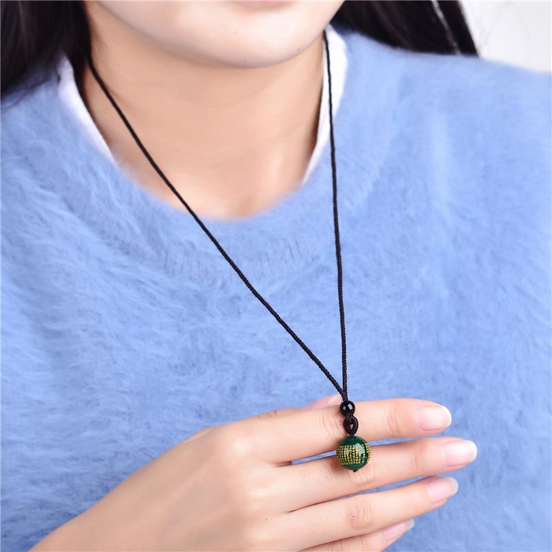 The Spirituality Buddha Karma Tibetan Buddhism Ancient Heart Sutra Necklace is a unisex necklace made of high-quality materials including Black Onyx, Wealth Solar Plexus Chakra (Third Chakra), Red Agate, White Crystal, and Green Crystal. The combination of these stones offers powerful vibrations of protection, prosperity, strength, focus, and willpower. Each stone has its own unique positive meaning and promotes spiritual growth, relaxation, and calmness. The necklace is handmade and natural, and may present slight irregularities due to its natural materials. It is recommended to take off the necklace when sleeping or washing.
