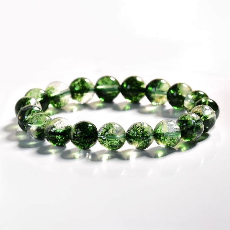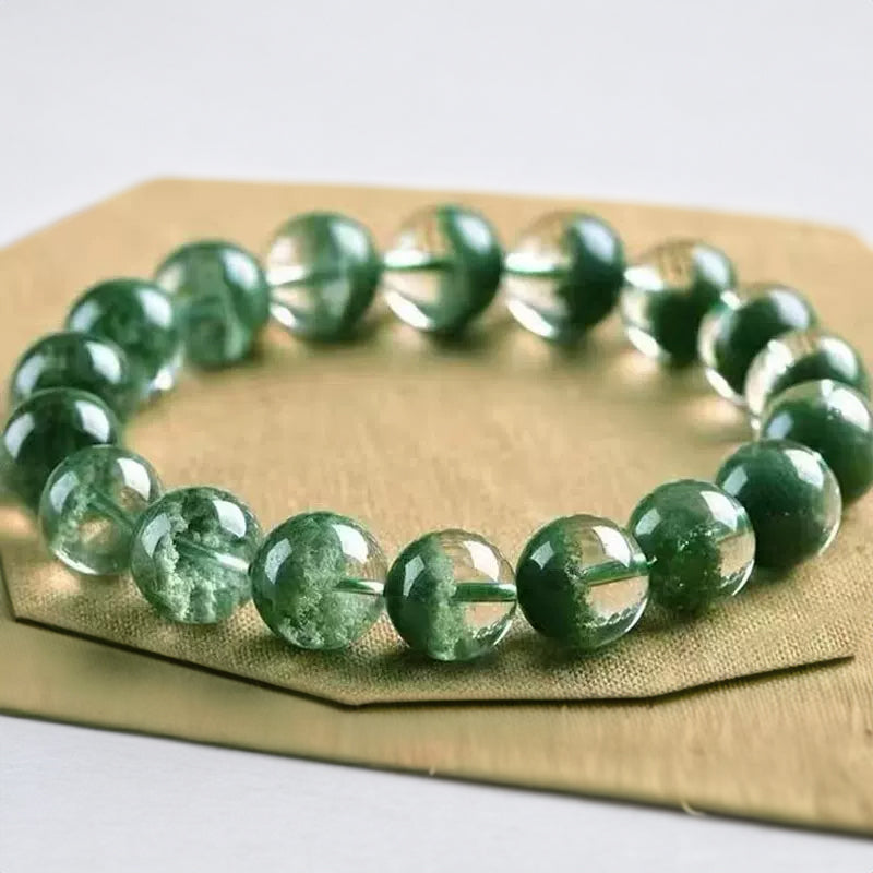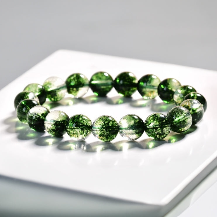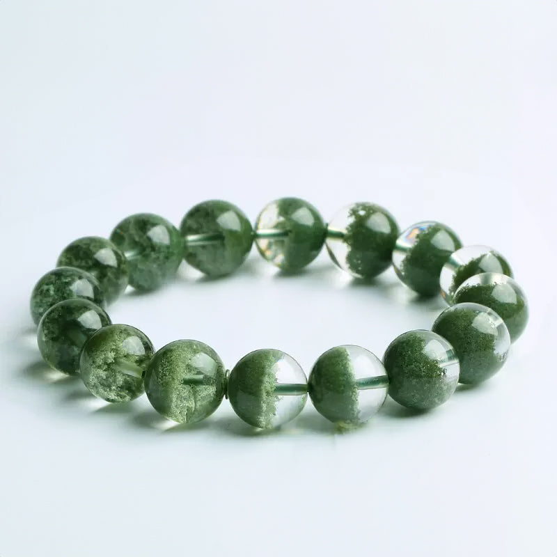 This Green Phantom Crystal bracelet showcases the unique energy and beauty of nature. Each translucent Green Phantom Crystal bead contains moss-like inclusions, symbolizing vitality and growth. This bracelet is not only a delicate piece of jewelry but is also believed to help balance the wearer's energy, enhance spiritual connection, and improve clarity. With its distinctive energy properties, Green Phantom Crystal is often used in meditation and energy healing, aiding in achieving inner peace and focus.
