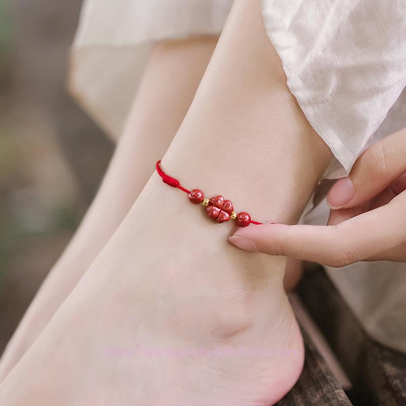 Ancient Tibetan Buddhist Red String Tradition Four Leaf Clover Cinnabar Blessing Calm String Bracelet Anklet