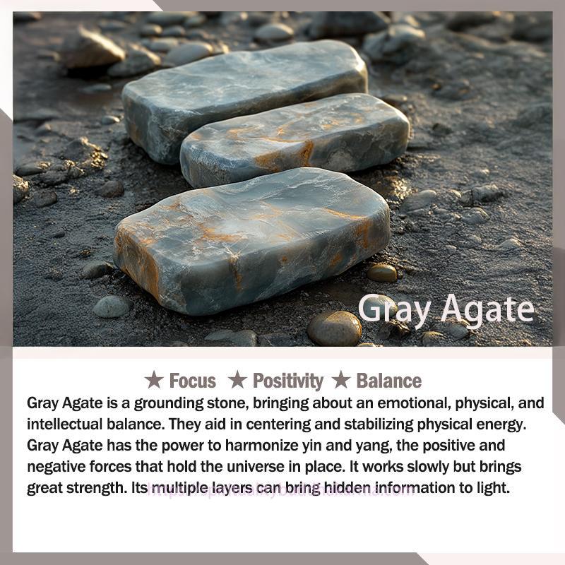 Gray Agate is a grounding stone, bringing about an emotional, physical, and intellectual balance. They aid in centering and stabilizing physical energy. Gray Agate has the power to harmonize yin and yang, the positive and negative forces that hold the universe in place. It works slowly but brings great strength. Its multiple layers can bring hidden information to light.