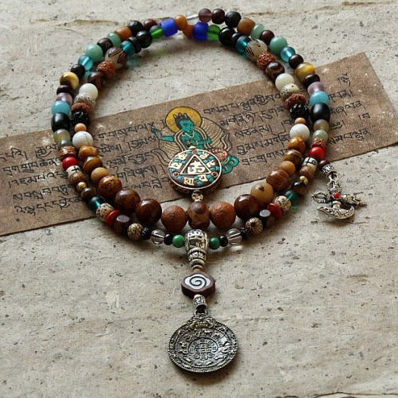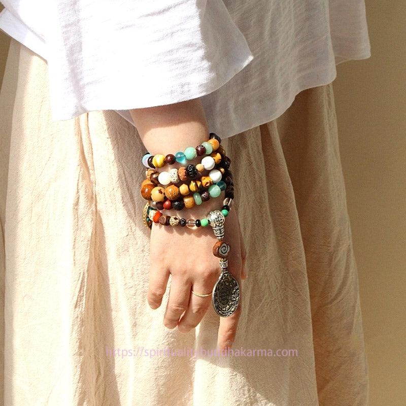 The Spirituality Buddha Karma Tibet 108 Mala Beads Nine Palaces Bagua Bodhi Seed Yak Bone Vajra Harmony Bracelet is a handmade accessory made with high-quality natural materials including bodhi seed, yak bone, and various gemstones. The bracelet features a Nine Palaces Bagua amulet containing "Bagua", "Zodiac Signs" and "Curse Wheel" and is designed to promote balance, harmony, strength, and protection from evil spirits. The bracelet is also believed to bring good luck and positive change, making it a meaningful addition to any spiritual or mindful practice