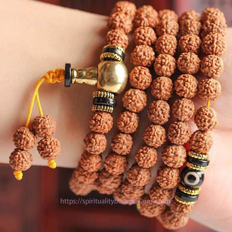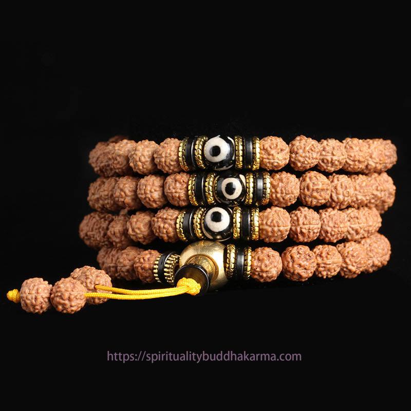 108 Mala Beads bracelet combines Rudraksha, Bodhi seeds, and Dzi beads to attract luck and wealth. This spiritual tool is designed for meditation and mindfulness, promoting inner peace. Its unique composition aids in focusing the mind during meditation, and bringing about a sense of well-being. Ideal for those seeking to deepen their meditation practice and attract positive energies into their lives.
