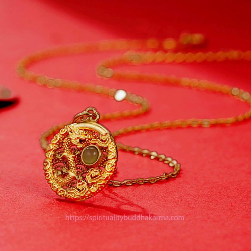 Spirituality Buddha Karma' Dragon Necklace merges traditional elegance with cultural significance. This piece, crafted from 925 sterling silver and adorned with Hetian jade, showcases the Year of the Dragon through its auspicious clouds design, symbolizing prosperity and good fortune. Perfect for those who cherish Eastern symbolism or wish to add a meaningful touch to their attire, it's an ideal choice for festive occasions or as a precious gift, resonating with cultural enthusiasts and jewelry aficionados alike.
