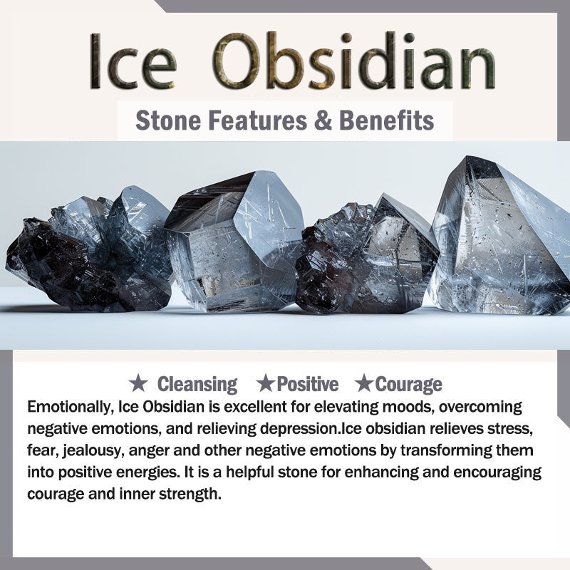Emotionally, lce Obsidian is excellent for elevating moods, overcoming negative emotions, and relieving depression. Ice obsidian relieves stress, fear, jealousy, anger and other negative emotions by transforming them into positive energies. It is a helpful stone for enhancing and encouraging courage and inner strength.