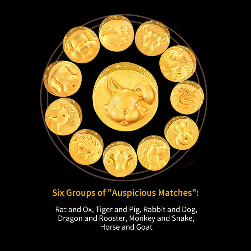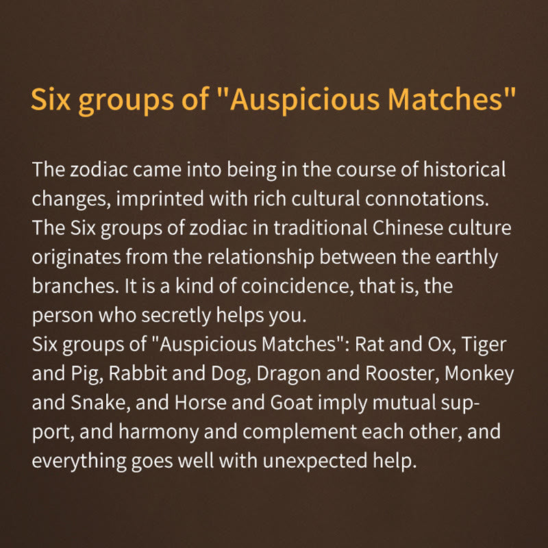 Six groups of "Auspicious Matches": Rat and Ox, Tiger and Pig, Rabbit and Dog, Dragon and Rooster, Monkey and Snake, and Horse and Goat imply mutual support, and harmony and complement each other, and everything goes well with unexpected help.