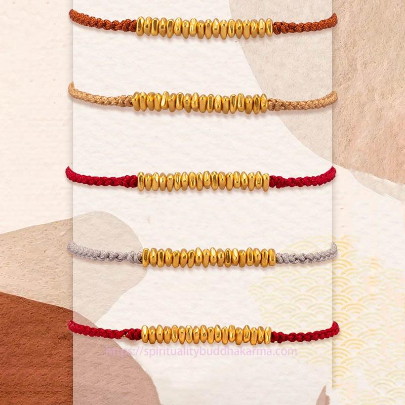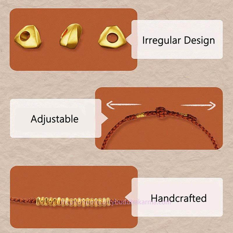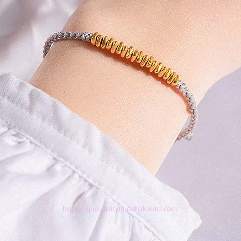 Small Gold Pieces Rope bracelet features 999 gold accents on a handcrafted braided rope. The gold pieces are carefully arranged to offer protection and symbolize strength. Made with durable braided rope, this bracelet combines practical wearability with spiritual significance. The design ensures lasting quality while providing a meaningful touchstone for personal security and empowerment.