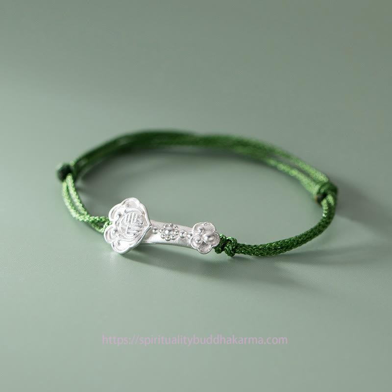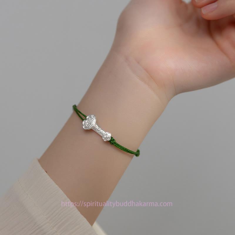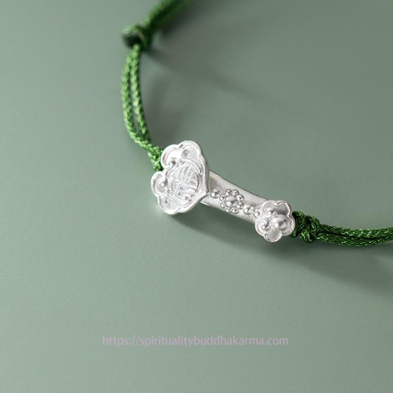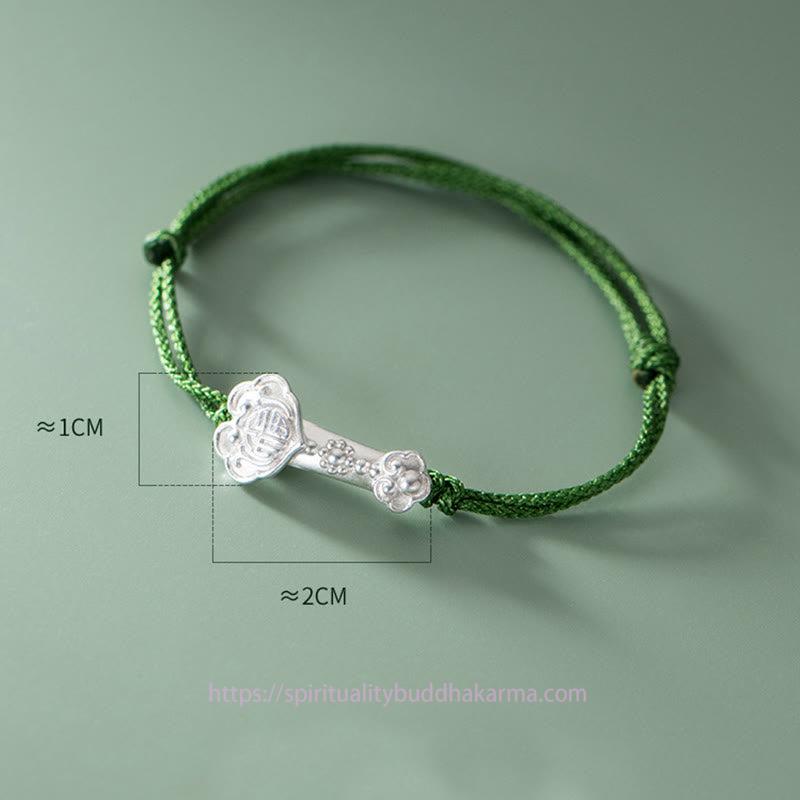 Silver Ruyi Green Rope bracelet features a sterling silver Ruyi Handle engraved with the auspicious "Fu" symbol, representing good fortune and blessings. The vibrant green braided rope adds strength and durability, while the silver centerpiece symbolizes a harmonious life. This bracelet is crafted to bring positive energy and prosperity to its wearer, making it a meaningful addition to any collection.