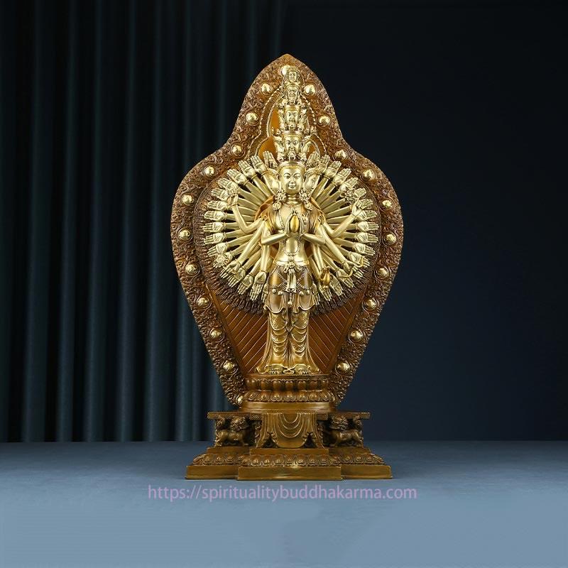 Thousand-armed Kwan Yin statue offers a profound symbol of compassion and prosperity. Crafted from brass and copper, this intricately designed statue represents Avalokitesvara with a thousand arms, embodying boundless generosity and the ability to bestow wealth. Ideal for enhancing spiritual spaces, it brings a sense of abundance and peace to any home or altar.