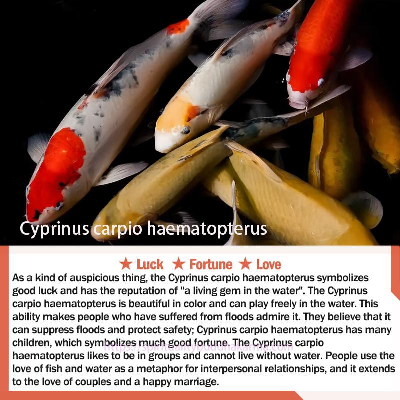 As a kind of auspicious thing,the Cyprinus carpio haematopterus symbolizes good luck and has the reputation of "a living gem in the water". The Cyprinus carpio haematopterus is beautiful in color and can play freely in the water.This ability makes people who have suffered from floods admire it They believe that it can suppress floods and protect safety:Cyprinus carpio haematopterus has many children,which symbolizes much good fortune.TheCyprinus carpio