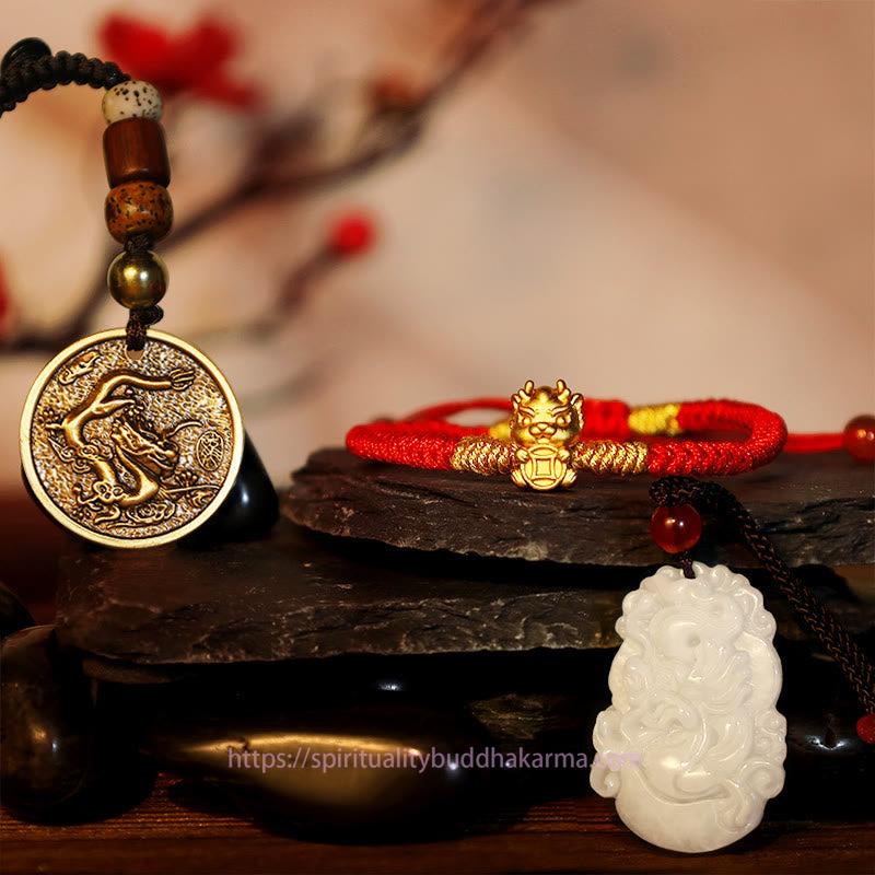 Package Included: Dragon Red String Bracelet*1,Dragon Jade Necklace*1, Lucky Copper Dragon Keychain*1, Lucky Money Dragon Envelopes*6