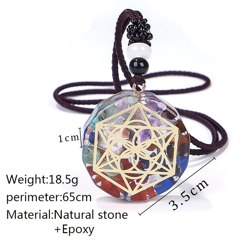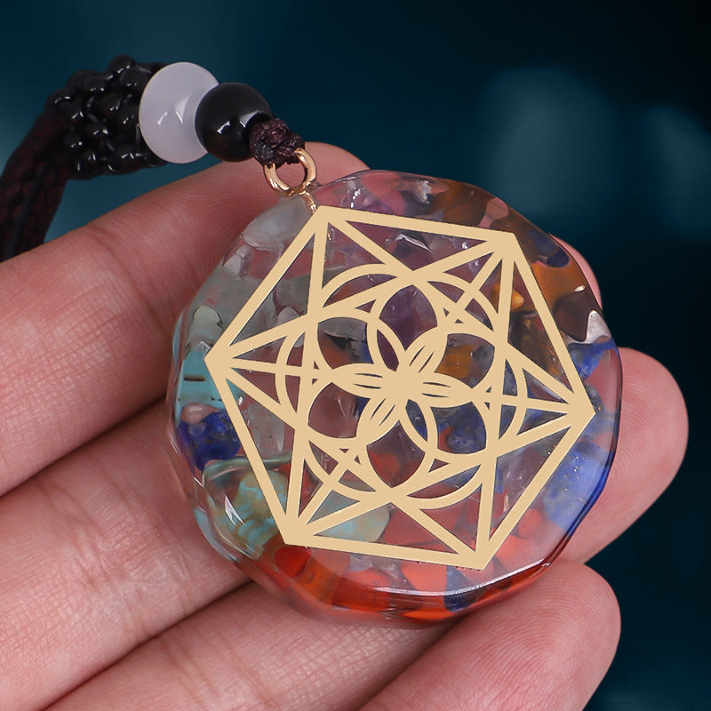 Product Description : This exquisite pendant features a harmonious blend of crystal and natural stone chips encased in premium epoxy resin. The multi-sided pendant is designed to amplify the energy from the crystals and stones, making it a powerful tool for those seeking emotional balance, spiritual connection, and positive energy alignment. The intricate geometric design symbolizes unity, balance, and the infinite nature of the universe.