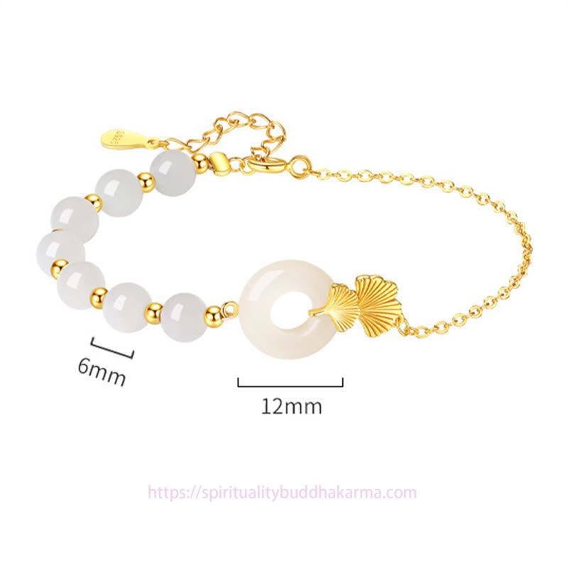 The Spirituality Buddha Karma 925 Sterling Silver Hetian White Jade Peace Buckle Ginkgo Leaf Luck Bracelet is a unique and meaningful piece of jewelry made by master craftsmen with high-quality materials. The Hetian White Jade is popularly used to realize wishes and dreams, while the peace buckle symbolizes peace and harmony, attracting positive energy and wealth. White Jade brings good fortune, luck, and protection, while silver provides calm, balance, and protection from evil spirits. The bracelet measures 14cm-18cm and features a premium chain band with a 12mm peace buckle and 6mm beads.