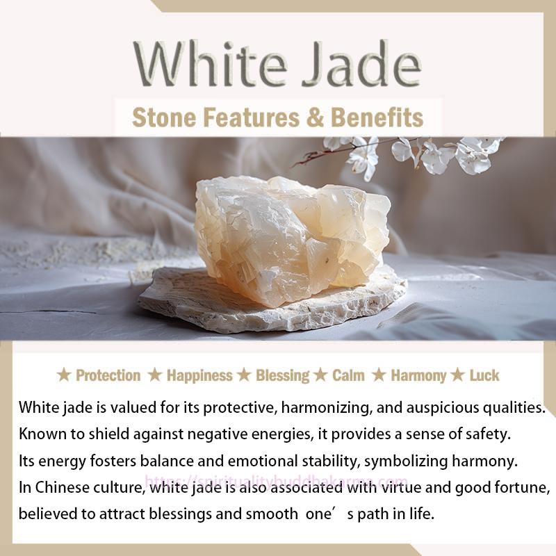 White Jade is said to be a stone of protection! White Jade brings the wearer good fortune, luck, and protection, improves and enhances thinking and clarity, calms the soul while uplifting your heart, and makes wishes come true. Besides, it can protect yourself and your loved ones from negative energy.