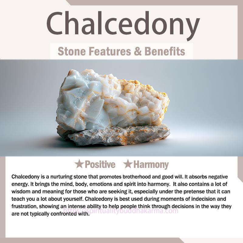 Chalcedony is a nurturing stone that promotes brotherhood and goodwill. It absorbs negative energy. It brings the mind, body, emotions, and spirit into harmony. It also contains a lot of wisdom and meaning for those who are seeking it, especially under the pretense that it can teach you a lot about yourself. Chalcedony is best used during moments of indecision and frustration, showing an intense ability to help people think through decisions in a way they are not typically confronted with.