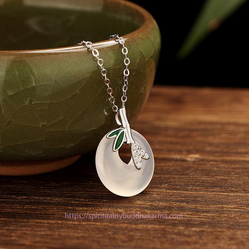 Spirituality Buddha Karma' Chalcedony Bamboo Leaf Pendant, crafted from 925 sterling silver, features a natural chalcedony peace buckle, symbolizing calmness and positivity. The bamboo leaf design adds a touch of natural elegance, embodying growth and renewal. This pendant is a serene accessory for those seeking a harmonious blend of nature's tranquility and refined craftsmanship.