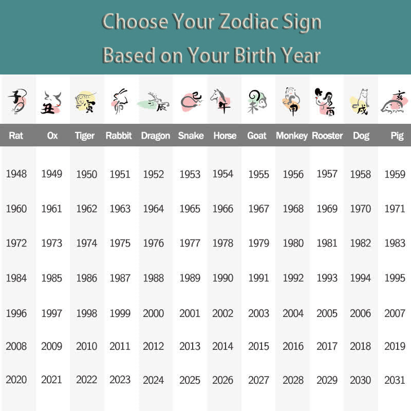 The 12 zodiac animals are shown below in order, with recent years for you to directly find out your own birth year and animal sign.
