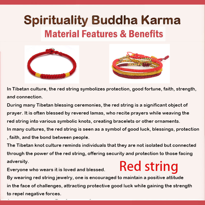 In lineages of Tibetan Vajrayana Buddhism, tying a cord or string around the wrist is common during ceremonies. Traditionally, the Lama blesses the string and then ties a knot and imbues it with a mantra. Similar to other traditions, it's said that these red cords bring luck and offer protection. In ancient Chinese legend, the Red Thread of Fate is - invisible and ties all those whose lives will intertwine together. It is governed by the Chinese God of marriage, Yue Lao, as it's primarily associated with the link between two people destined to be married. Throughout history and across philosophies, the red string has been worn for protection, faith, good luck, strength, and connection.