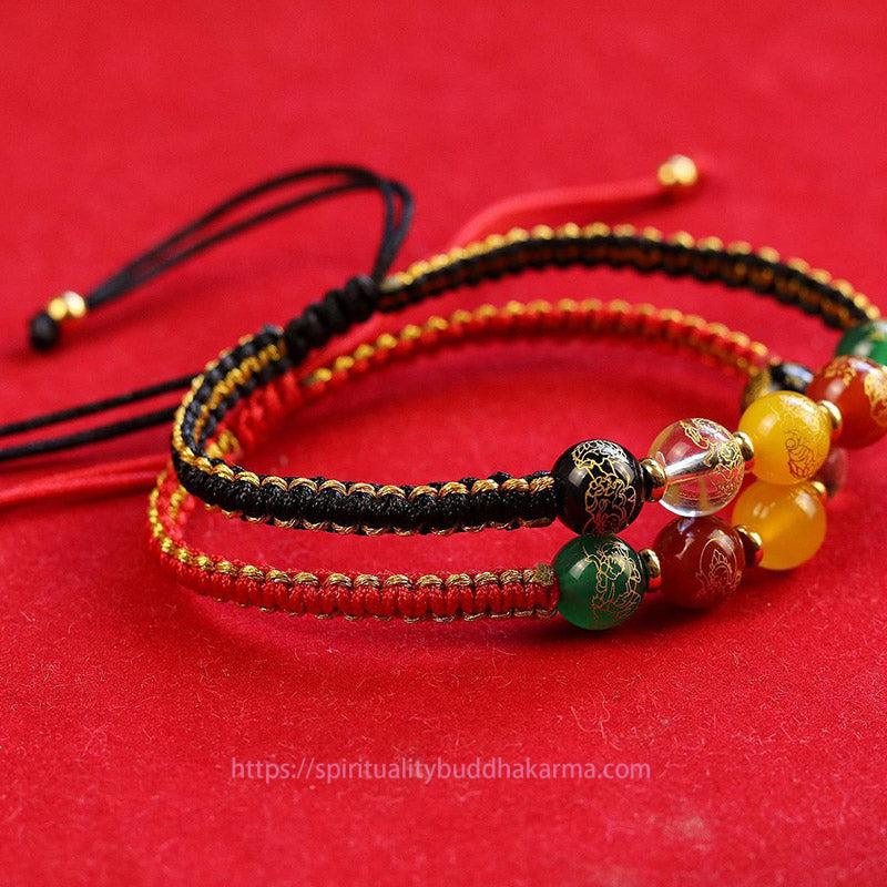 Ancient Tibetan Buddhist Red String Tradition Five Directions Gods of Wealth Agate Handmade Protection String Braid Bracelet