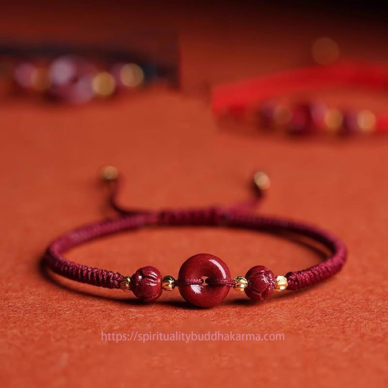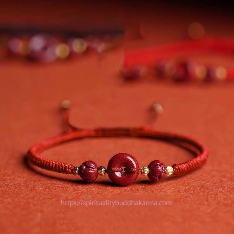 Cinnabar Rope bracelet, hand-braided with deep red cord, embodies tranquility and blessings. A cinnabar peace buckle, flanked by lotus-carved cinnabar beads, anchors the design, symbolizing harmony and spiritual growth. Cinnabar, revered for its protective qualities, promotes calmness and wards off negativity. This bracelet serves as a tangible reminder to cultivate inner peace and embrace life's blessings.