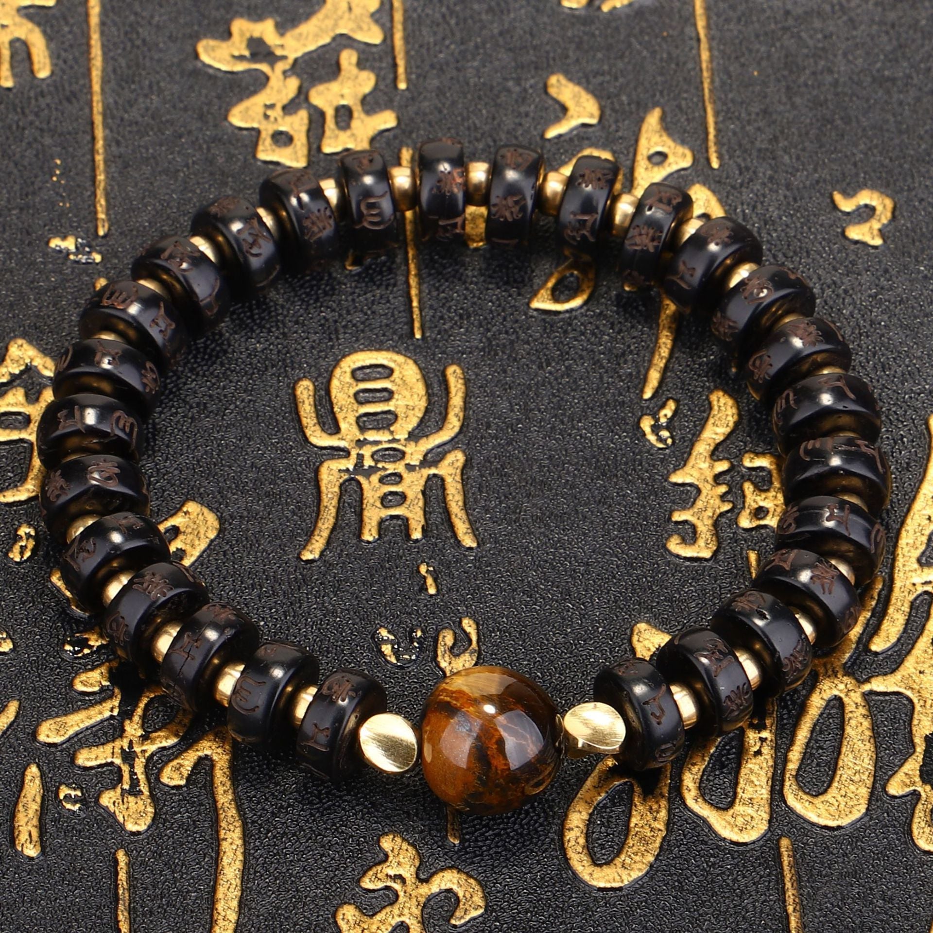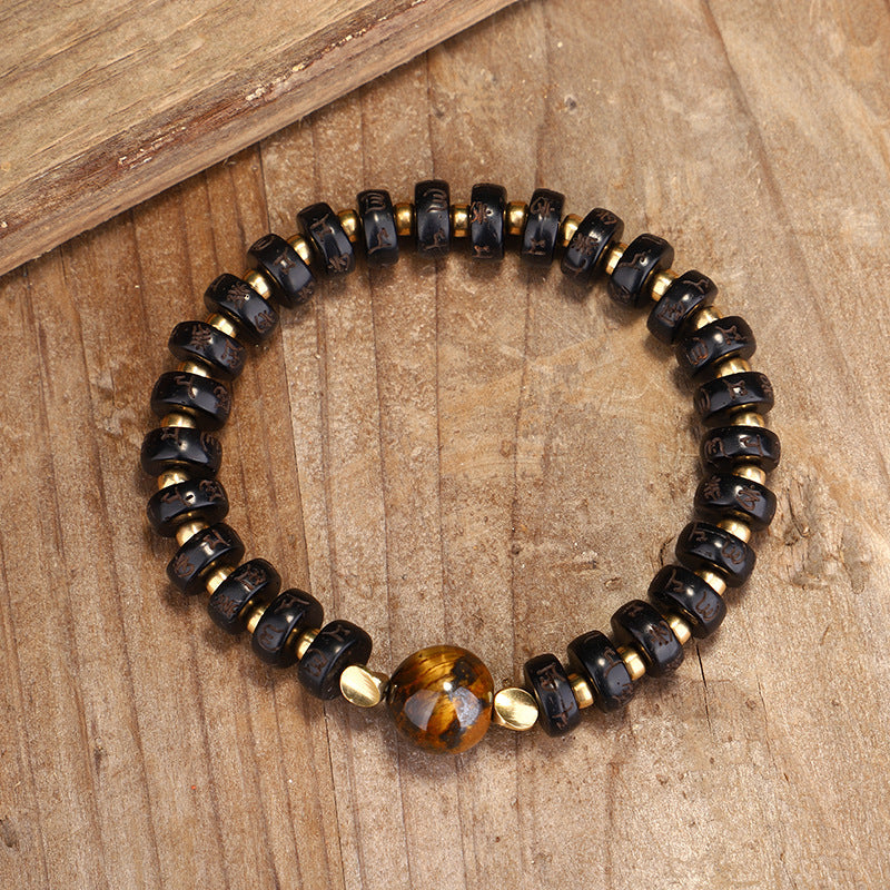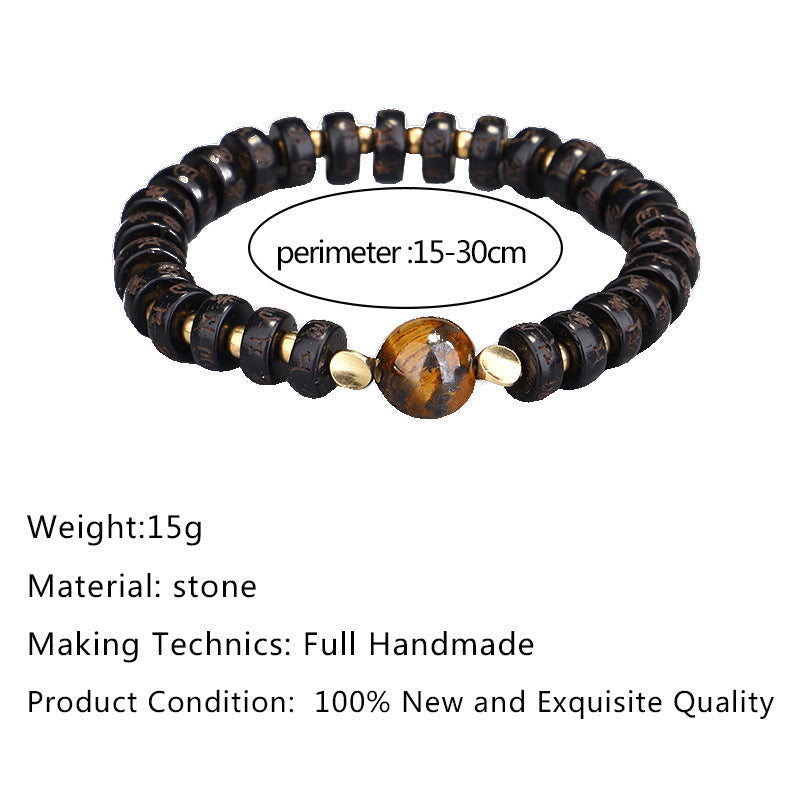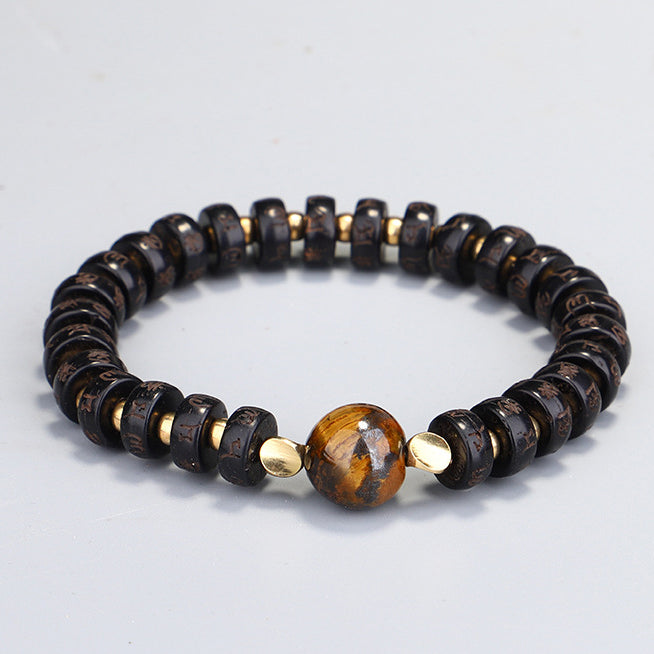 This beautifully handcrafted bracelet combines the earthy texture of natural coconut shell beads with the powerful energy of a central tiger eye stone. The bracelet symbolizes protection and strength, with each coconut bead intricately inscribed with Tibetan mantras. The tiger eye stone, known for its grounding and protective properties, is believed to enhance courage, stability, and confidence. With a fully adjustable design, this bracelet suits a variety of wrist sizes and is perfect for daily wear or spiritual practice. A combination of tradition and style, this piece brings a touch of mindfulness to any occasion.