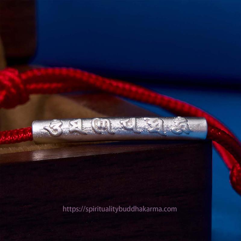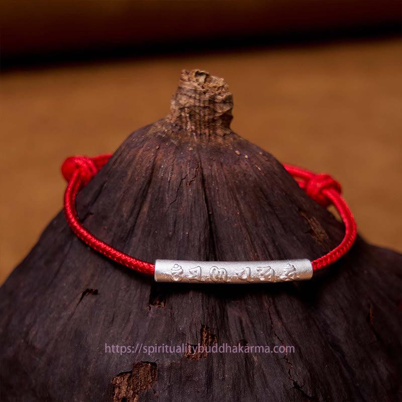 Sterling Silver Strength Red Rope bracelet features a central silver cylinder engraved with the sacred mantra "Om Mani Padme Hum." Crafted from 999 sterling silver, this bracelet is enhanced with a vibrant red rope. The design symbolizes inner strength and spiritual protection, making it a meaningful accessory. The adjustable red rope ensures a comfortable fit while the engraved mantra provides continuous support and inspiration.