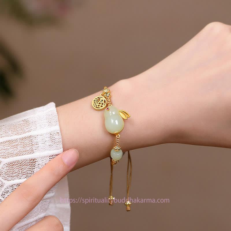 The Year of the Rabbit Hetian Jade Happiness Blessing Wealth String Bracelet is made of Hetian Jade, a rare and precious stone famous for its durability and beauty. It is believed to bring good fortune, wealth, and happiness.
